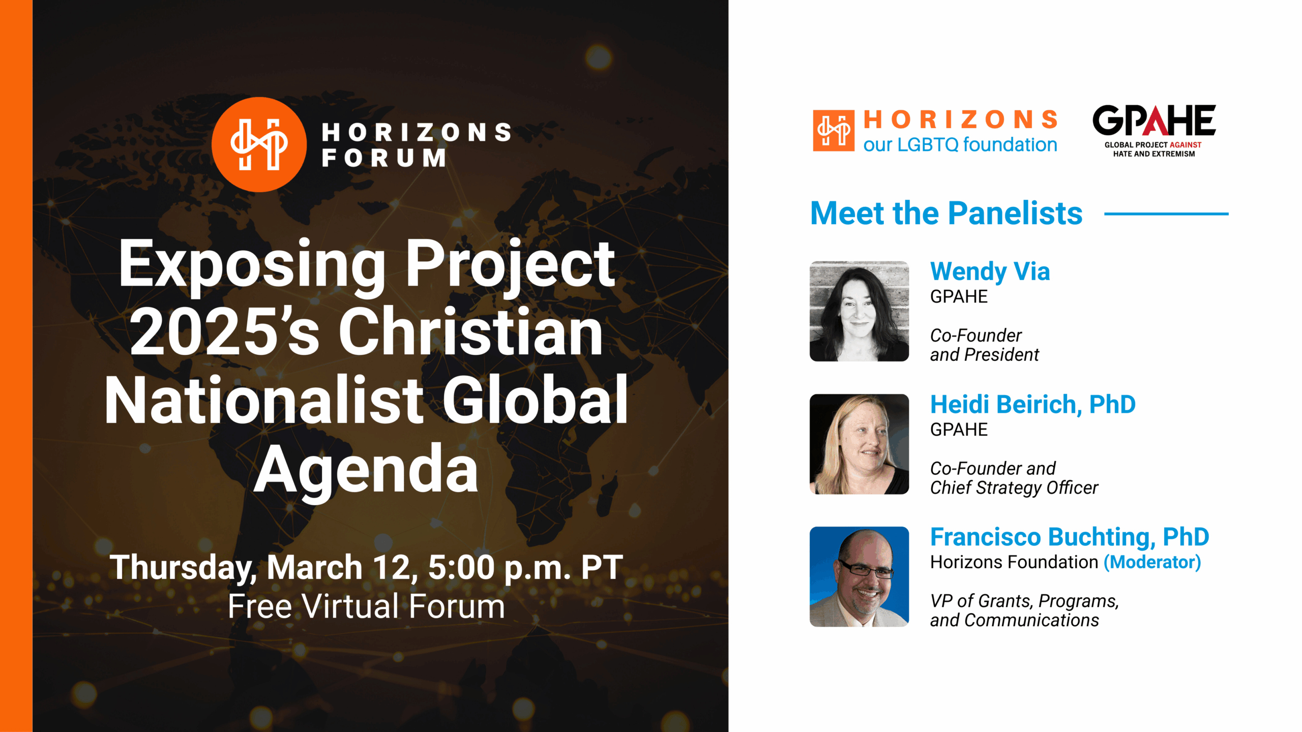 A new report by the Global Project Against Hate and Extremism (GPAHE) exposes and scrutinizes Project 2025’s global efforts to dismantle fundamental human rights, identifying key players and tracing its exportation of a far-right, Christian nationalist agenda worldwide. Join Horizons Forum on Thursday, March 12 at 5:00 p.m. PT and be part of this important conversation.